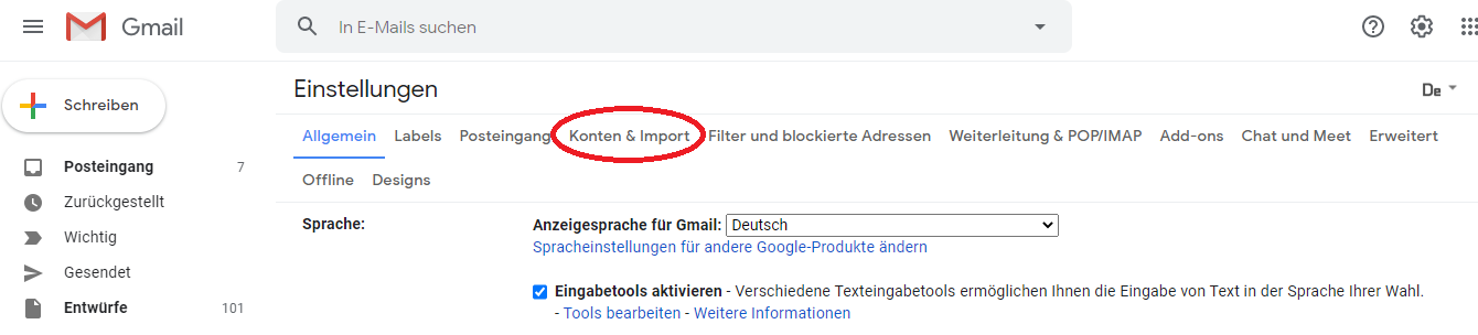 Wähle den Reiter "Konten & Import" aus.