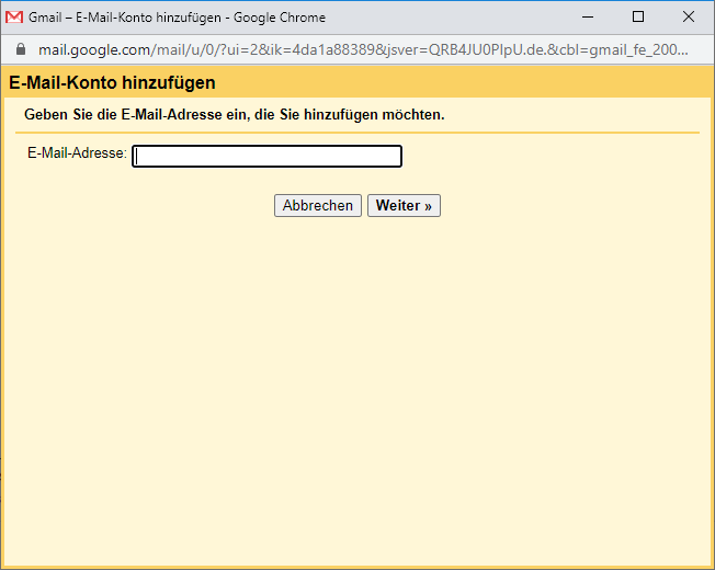 Es erscheint ein neues Fenster. Gib dort deine E-Mail-Adresse ein, die du hinzufügen möchtest und klicke auf "Weiter".