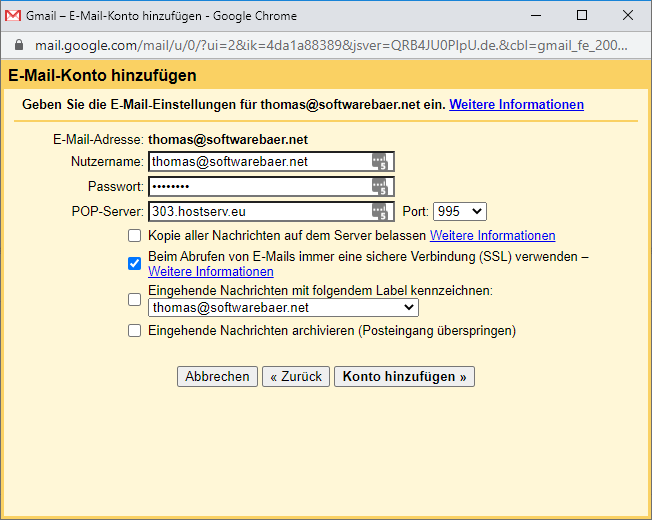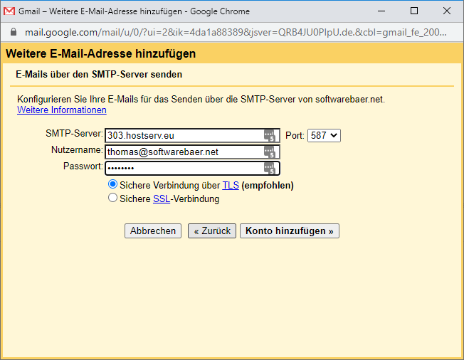 Es wird nun folgender Dialog angezeigt. Trage folgendes ein und klicke danach auf "Konto hinzufügen":