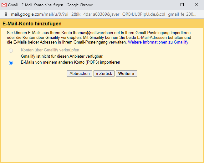 Es erscheint ein neues Fenster. Gib dort deine E-Mail-Adresse ein, die du hinzufügen möchtest und klicke auf "Weiter".
