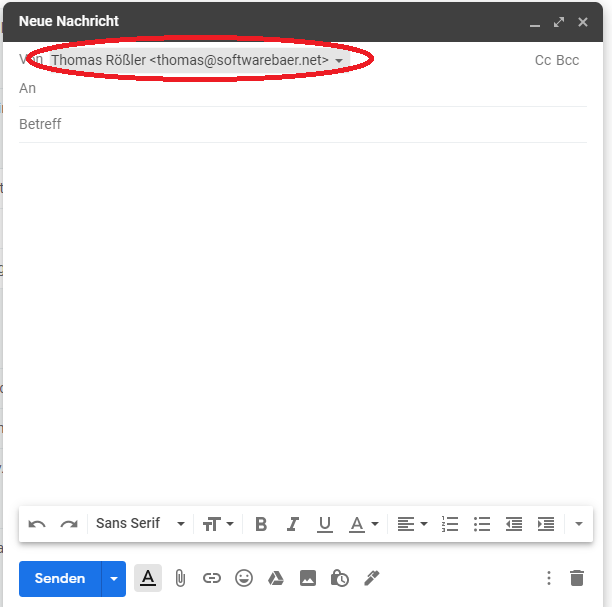 Sobald du GMail im Browser neu lädtst, kannst du E-Mails nun auch über die neu eingerichtete E-Mail-Adresse verschicken. Klicke dazu auf das Feld "von" und wähle die gewünschte E-Mail-Adresse als Absender aus.